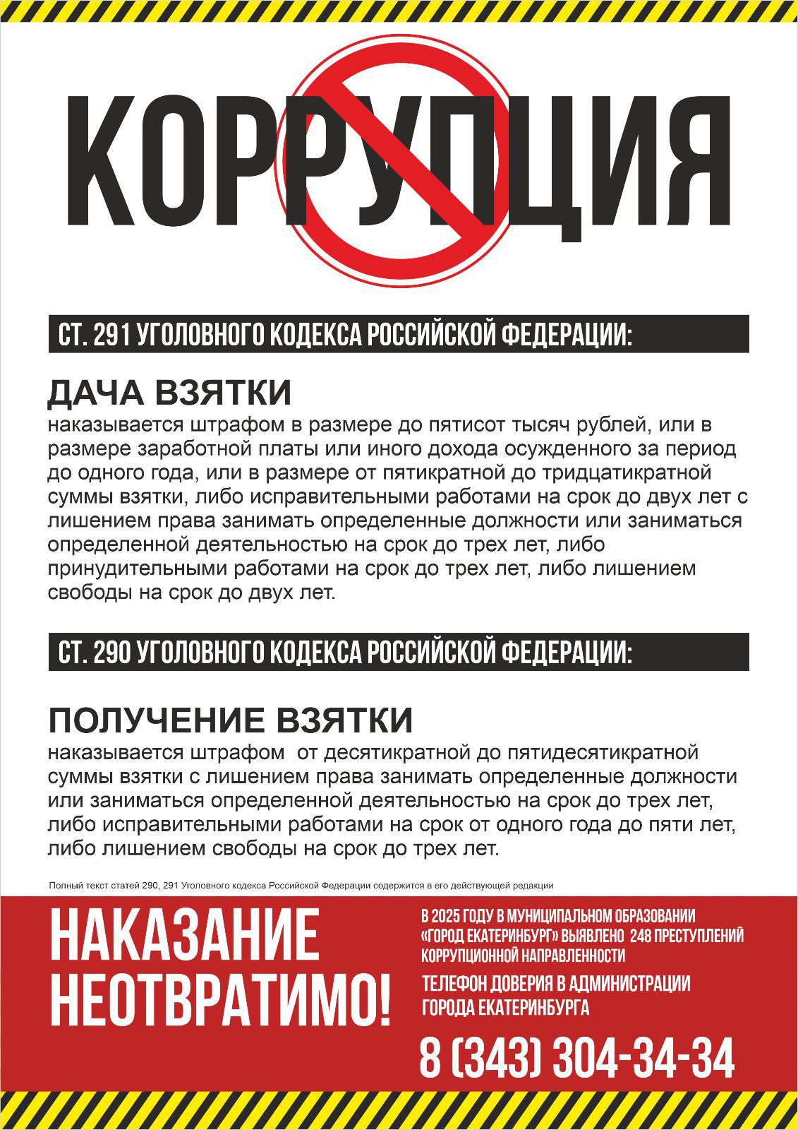 - номер телефона доверия для приема сообщений о фактах коррупции в Администрации города Екатеринбурга — (343) 304-34-34,
