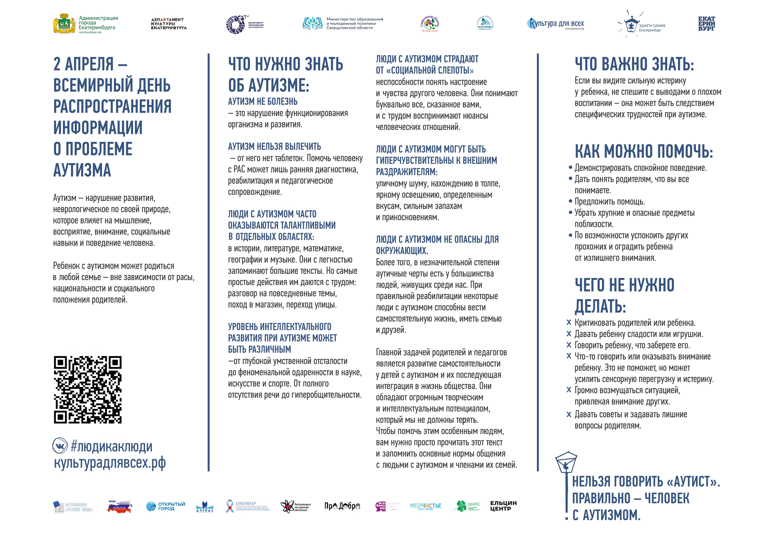 Зажги синим2 апреля в Екатеринбурге в десятый раз состоится общегородская акция «ЗАЖГИ СИНИМ», посвященная Всемирному дню распространения информации о проблеме аутизма. В этот день по всему миру знаковые здания и памятники освещаются синим цветом, который считается международным символом аутизма, проводятся мероприятия, направленные на привлечение внимания общественности к проблемам аутизма. В Екатеринбурге 2 апреля с 20:00 до 23:00 некоторые городские здания будут подсвечены синим цветом. Также планируется подсветка синим цветом здания Администрации города Екатеринбурга и работа праздничной иллюминации по проспекту Ленина и по улице Свердлова. Главный акцент акции – «Уроки доброты», которые состоятся с 31 марта по 5 апреля в детских школах искусств, культурно-досуговых центрах, общеобразовательных учреждениях Екатеринбурга и Екатеринбургской академии современного искусства. Корректная, необходимая и понятная информация об аутизме, в т.ч. видеоролики для разных возрастов, собрана на специально разработанном сайте: культурадлявсех.рф/люди_как_люди. С 2016 года акция «Зажги синим» в поддержку людей с аутизмом и их семей проходит при поддержке Администрации города Екатеринбурга. Инициатором проведения выступила Ассоциация граждан и организаций «Особые люди», организатором акции является Департамент культуры Администрации города Екатеринбурга.